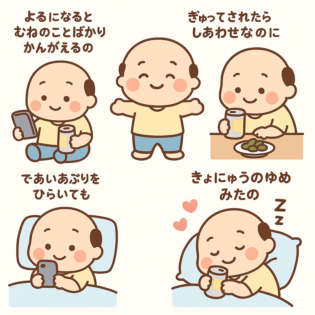 酔いどれ禿おやじが出会いアプリをのぞきながら、お酒と孤独と少しの夢を語る日記。寂しい夜に人肌が恋しくなる人へ。かわいくて切ない酔っ払いエッセイ。