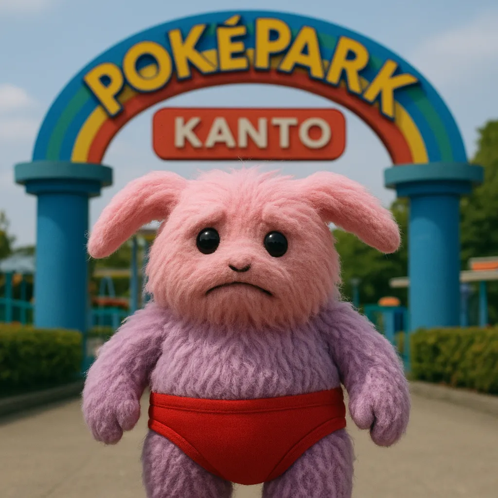 ピンクと紫のふわふわボディに赤いパンツという、あの幻獣そのものの姿。